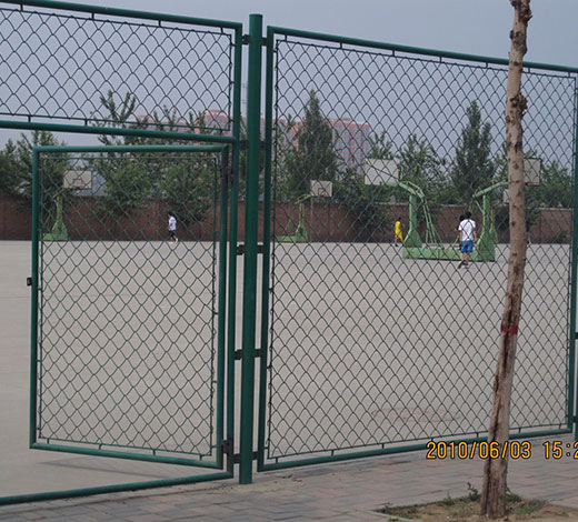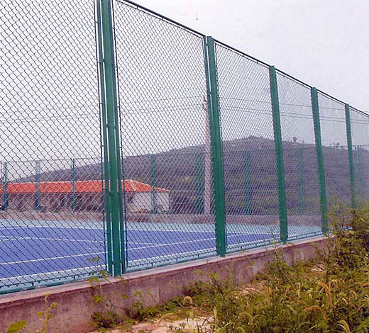 采用φ3.8鍍鋅線包塑網,網孔規格45MM×45MM,網高4 M,立柱用φ75鋼管,橫柱用φ60鋼管刷二遍防銹專用底漆,二遍墨綠色面漆,包塑網用包塑扁鐵壓緊,用鍍鉻螺絲固定于網架上,做一扇1200×2000MM單門。在基礎施工時,按照預埋件施工示意圖所標明的尺寸,要先預埋好預埋件。挖500*500的地槽,燈柱預埋件的尺寸為300*300mm,圍網預埋件的尺寸為 250*250mm。每個預埋件用4個12mm的鋼筋焊接固定,鋼筋的長度為400mm。鋼筋在端部彎起。 圍網由包塑網、立柱、橫桿以及連接構件組成。網高4米,所以在圍網中間設立一跟橫桿,用φ75鋼管,主要增強圍網的受力。圍網立桿的間距由球場四周范圍的尺寸決定,一般間距不超過3.8米。也不能太小,否則增加成本。
